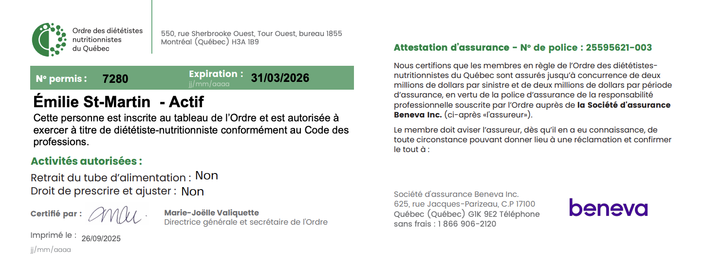 Membre de l’Ordre des diététistes-nutritionnistes du Québec (ODNQ) depuis 2019 (# de permis : 7280)